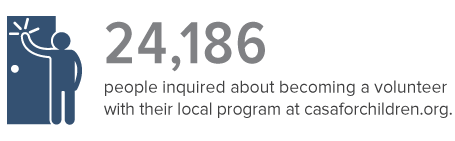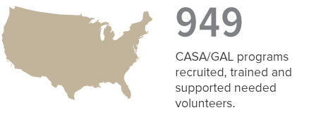 Across our nation, more than 251,000 abused or neglected children have a caring CASA volunteer or GAL, but hundreds of thousands more are still waiting. We recognize that we must grow the number of volunteers, and develop innovative solutions, to achieve our goal of providing an advocate for every abused or neglected child in need. Our framework emphasizes focus on providing support to local member programs; building strong partnerships with member state organizations; improving our data collection, research, and analysis; developing a stronger platform for financial stability; and achieving new heights in governance effectiveness.