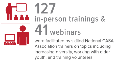 Additionally, we began the first phase of organizational restructuring to provide increased support to member programs, designing a structure that increased or reallocated resources to critical focus areas, such as resource development, training, planning, and research. In alignment with the strategic framework, the National CASA Board of Trustees also embarked on its own change initiative during this time, turning their efforts toward identifying, planning for, and executing a new governance model.